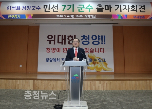 이 군수는 6일 오전 기자회견을 열고 "돌아오는 6.13지방선거에 누가 민선7기 군수가 되어야 중단 없이 청양을 발전시킬 수 있을까 하는 고민 끝에 그 적임자가 '이석화다'라는 결론에 도달했다"고 언급했다.