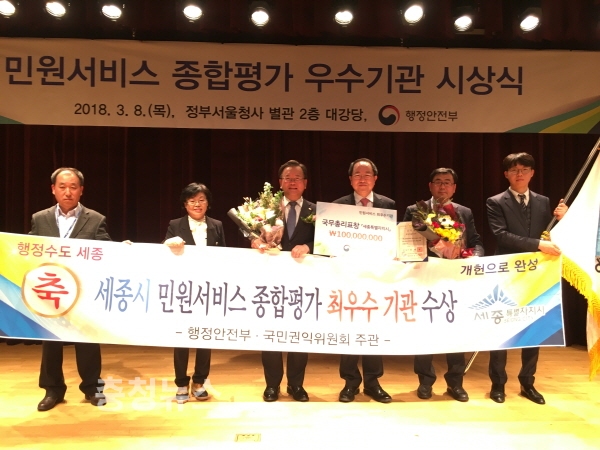 민원서비스 종합평가는 중앙행정기관, 시도 교육청, 광역 및 기초지자체 등을 대상으로 실시했으며, 이번 평가결과에 따라 세종시는 국무총리표창 수상과 1억원의 특별교부세(인센티브)를 부여받는다.
