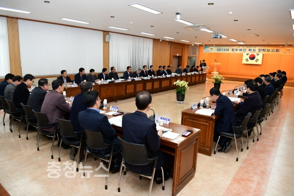 충남 홍성군은 9일 군청 대강당에서 김석환 홍성군수, 홍문표 국회의원, 김덕배 군의회 의장과 군의원 및 도의원, 군청 부서장 등 50여 명이 참석한 가운데 2019년 정부예산확보 전략보고회를 개최했다.