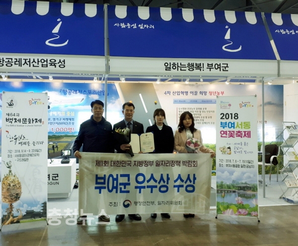 충남 부여군(군수 이용우)은 일산 킨텍스에서 지난  8일~11일까지 개최된 ‘제1회 대한민국 지방정부 일자리 정책박람회’에 ‘SKY 드림! 항공레저 산업 육성’, ‘4차 산업혁명 희망 청년농부 육성’을 주제로 참가해 우수상인 국토교통부 장관상을 수상했다.