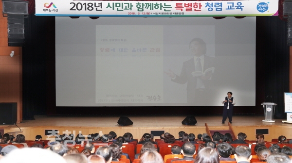 충남 서산시가 12일 시 문화회관에서 공무원, 이·통장, 공사 및 보조사업 관계자 등 400여명이 참석한 가운데‘시민과 함께하는 특별한 청렴교육’을 실시했다.