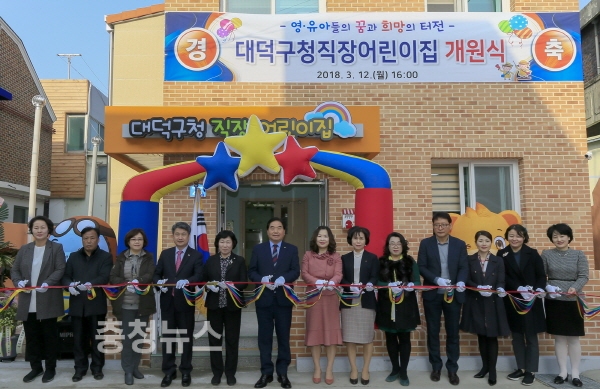 대덕구 직장 내 보육 인프라 확충과 보육 환경 조성을 위해 마련된 직장어린이집은 박수범 대덕구청장과 김금자 대덕구의회 부의장을 비롯한 구의원들, 지역 내 어린이연합회장 등 90여 명이 참석한 가운데 12일 개원식을 갖고 운영에 들어갔다.