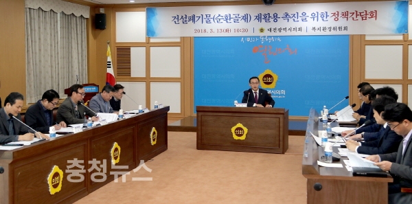 대전시의회 복지환경위원회는 13일 대전광역시의회 대회의실에서‘건설폐기물(순환골재) 재활용 촉진을 위한 정책간담회’를 개최했다.