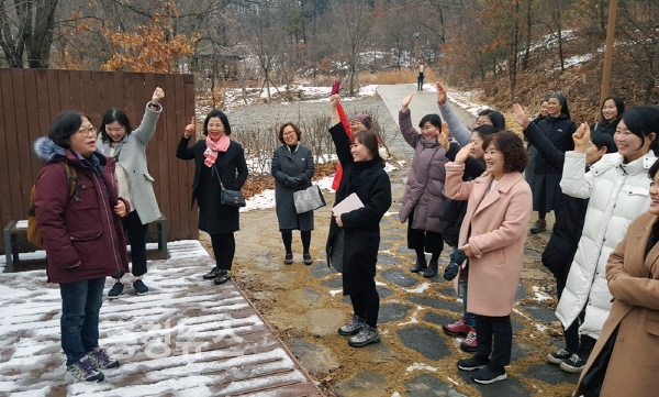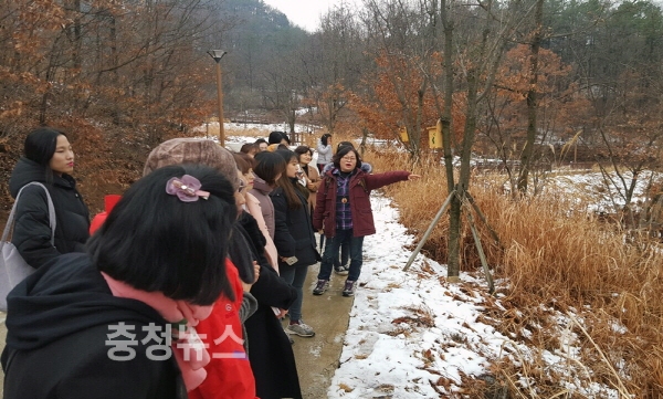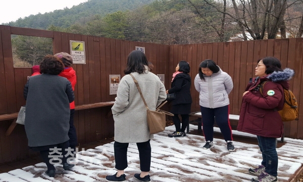 한국산림복지진흥원 유아숲교육팀 직원이 13일 세종시 원수산에 위치한 파랑새유아숲체험원에서 2018년 정기형 프로그램에 참여하는 20여 개 기관 관계자들을 대상으로 산림교육프로그램 등을 설명하고 있다.