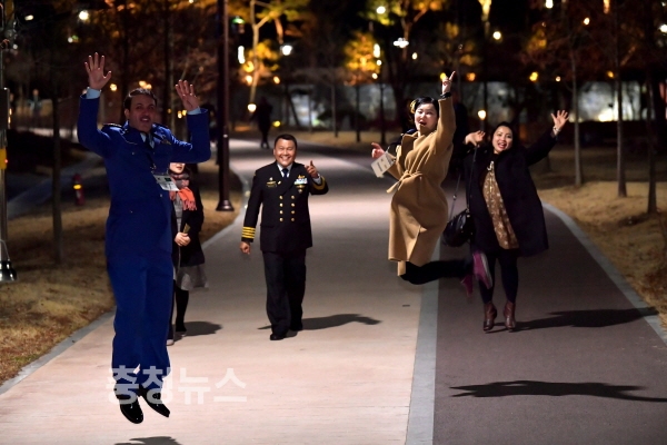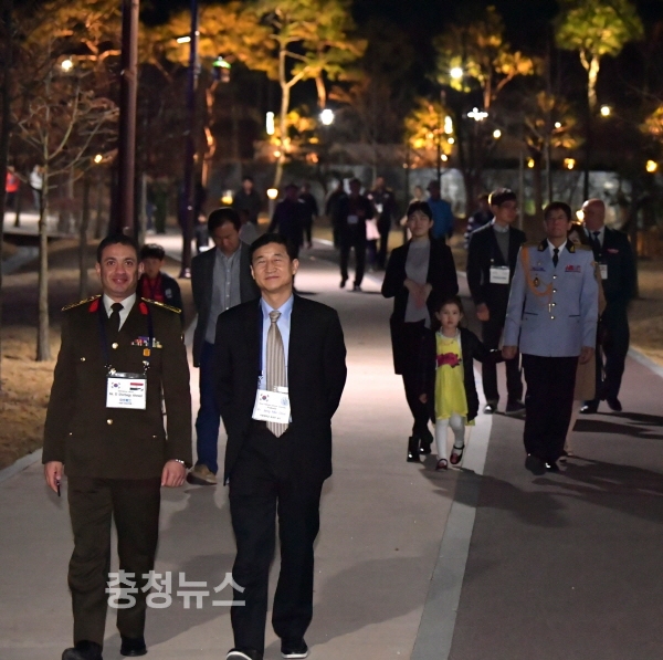 향긋한 꽃향기 가득한 봄날, 국방대학교 외국군장교와 가족들이 논산시민공원을 찾아 시민공원의 아름다운 야경을 즐기고 있다.