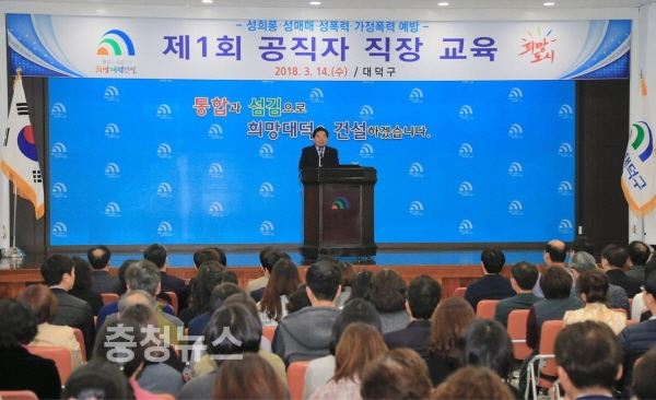 대덕구는 14일 구청 청렴관(옛 대강당)에서 직원 500명을 대상으로 올해 첫 직장교육으로 ‘성희롱․성매매․성폭력․가정폭력 예방 통합교육’을 실시했다고 밝혔다.