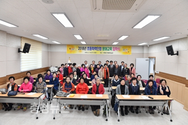 충남 부여군(군수 이용우)은 비문해 어르신들의 기초생활 능력 향상을 위해 2018년 초등학력인정 문해교육 프로그램을 마련했으며, 지난 14일 부여군 평생학습관에서 입학식을 개최했다.