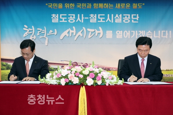 한국철도공사 오영식 사장(사진 왼쪽)과 한국철도시설공단 김상균 이사장(사진 오른쪽)이 양해각서에 사인을 하고 있다.