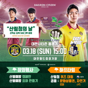 한편, 이 날 경기는 ‘산림청의 날’로 진행된다. 산림청과는 지난 해 이어 2회째 인연을 맺게 되었다. 경기 전, 남문광장에서는 나무묘목 500그루가 선착순으로 증정되며 김재현 산림청장의 시축이 예정되어 있다. 하프타임에는 산림청 퀴즈 대회를 통해 자전거, 문화상품권 등의 경품이 증정된다.