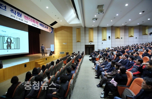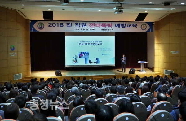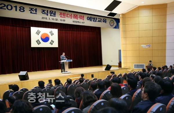 대전 서구(구청장 장종태)는 지난 16일 구청 대강당에서 장종태 서구청장을 비롯해 직원 500여 명이 참석한 가운데, 젠더폭력 예방교육을 시행했다고 밝혔다.
