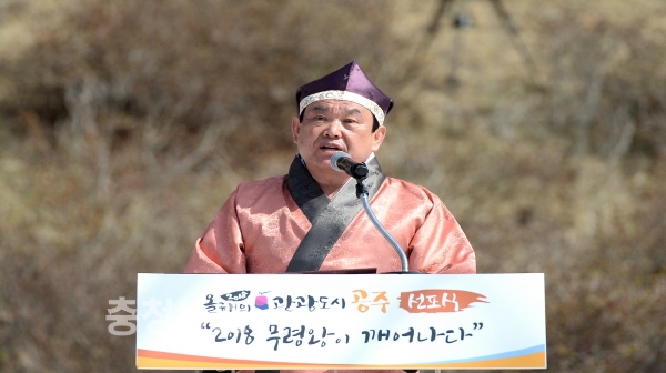 2018 올해의 관광도시 선포식에서 축사를 하고 있는 오시덕 공주시장 모습