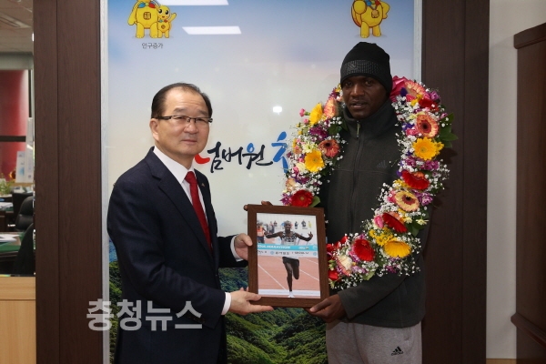이석화 청양군수는 이 자리에서 포상금 1만 달러를 전달하면서 “작지만 강한 청양을 알리고 대한민국의 육상 발전을 위한 인적 보배”라고 격려했다.
