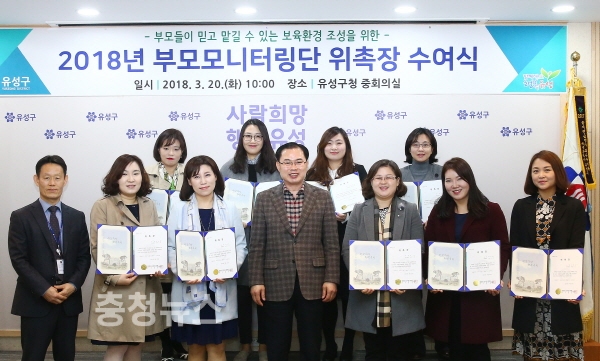 대전 유성구는 20일 구청 중회의실에서 ‘2018년 부모모니터링단원’ 10명에게 위촉장을 수여하고 오는 4월부터 본격적인 활동을 시작한다고 밝혔다.