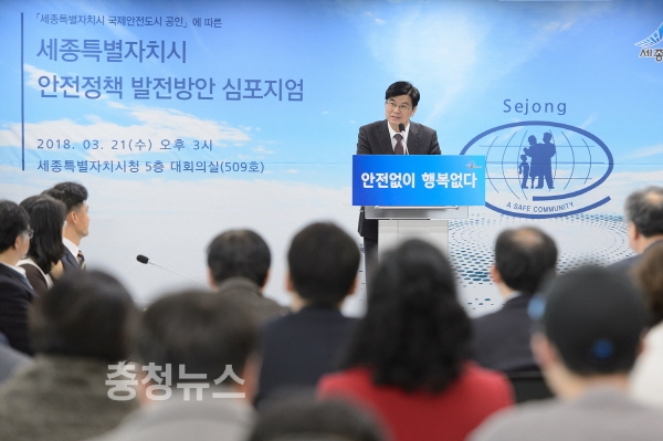 세종시(시장 이춘희)는 21일 청사 내 세종실에서 이춘희 시장과 박재묵 대전세종연구원장, 안전관련 전문가, 유관기관 관계자, 시민단체 등 100여명이 참석한 가운데 ‘세종시 안전정책 발전방안 심포지엄’을 개최했다.