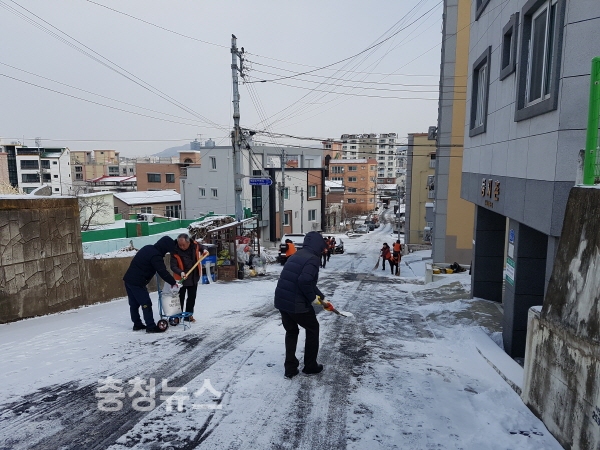 부사동 통장협의회, 자원봉사협의회 등 3개 동 자생단체 회원과 주민센터 직원 등 50여명이 참여해 골목길 눈을 쓸고 눈이 얼지 않도록 염화칼슘을 뿌렸다.
