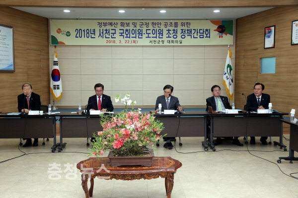충남 서천군(군수 노박래)은 22일 군청 대회의실에서 2019년 정부예산 확보에 대한 정책적 지원과 협조를 구하기 위해 김태흠 국회의원을 초청하고 정책간담회를 개최했다.