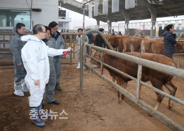 이석화 청양군수는 23일 송아지 경매가 열린 청양가축시장을 방문해 축협관계자와 함께 가축판매가격과 거래 현황 등을 살펴보고 축산농가를 격려했다.