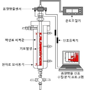 원자력연구원 원자력재료연구부 심희상, 허도행 박사 연구팀이 개발한 ‘냉각수 비등현상 음향방출 탐지·분석기술’은 잠수함 음향탐지 등에서 사용되는 기술을 활용한 것으로, 핵연료피복관에 설치한 센서로 고온고압 조건에서 기포 발생시 나타나는 음파를 탐지, 실시간으로 기포 발생 여부와 발생량을 분석한다. 연구팀은 탐지 장비는 물론 환경신호와 기포 발생 신호를 분리할 수 있는 분석방법도 개발했다.