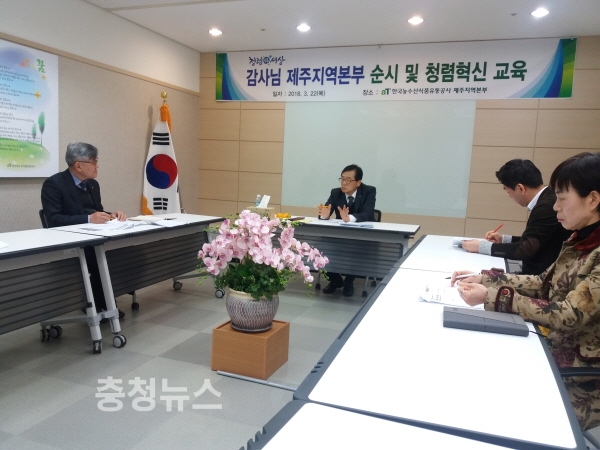 한국농수산식품유통공사(aT, 사장 이병호) 김명곤 상임감사는 지난 22일부터 23일까지 2일간 aT 제주지역본부를 비롯, 부산울산 및 경남지역본부 주요 사업현장을 찾아 직원들을 격려하고 청렴문화 전파를 위한 청렴교육을 실시했다.