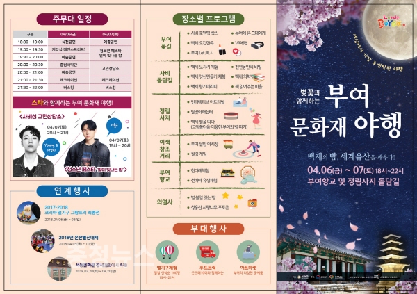 문화재청과 충청남도가 후원하고 부여군이 주관하는 ‘2018 부여 문화재 야행’이 4월 6~7일 정림사지 및 부여향교 벚꽃길 일원에서 열린다.