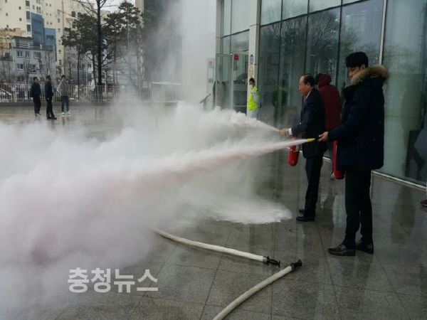 민방위 화재대피 훈련은 통보훈련, 대피훈련, 옥내소화전과 분말소화기를 이용한 화재대피 진압 훈련 등으로 실시했다.