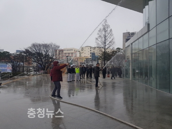 오후 2시 경보발령과 동시에 민방위화재대피방송이 건물내에 전파됐고, 훈련참석자들은 비상계단을 이용해 1층 광장으로 신속하게 대피했다.