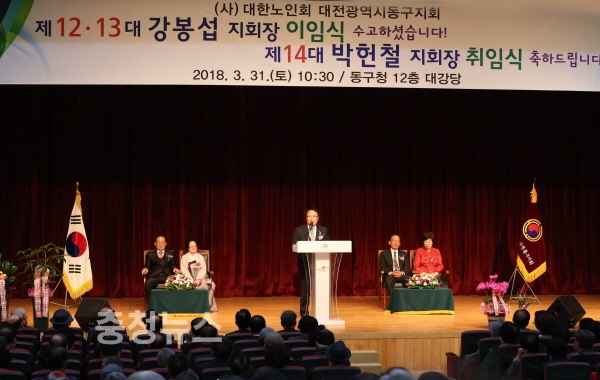대전 동구(구청장 한현택)는 31일 동구청 대강당에서 제14대 대한노인회 동구지회 박헌철 지회장 취임식과 제12,13대 강봉섭 지회장 이임식이 주민 400여 명이 참석한 가운데 성황리 개최됐다.