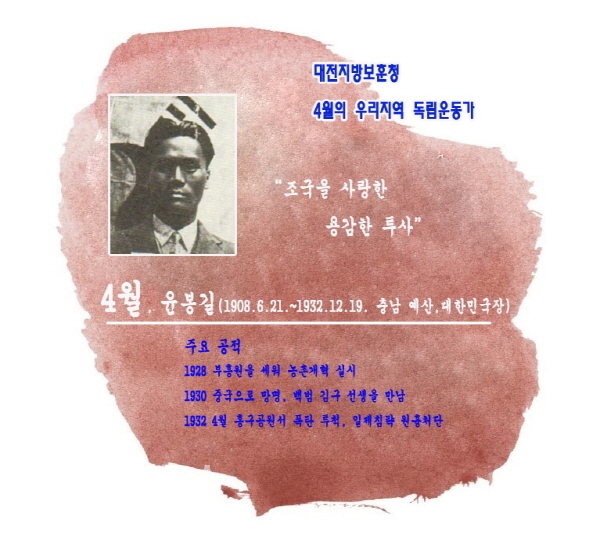 대전지방보훈청(청장 강윤진)은 청소년 및 시민에게 애국선열의 위국·헌신정신을 알리고 보훈정신 함양에 기여하고자'이달의 우리지역 독립운동가'를 선정한다고 2일 밝혔다.