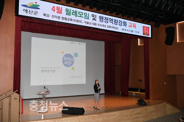 충남 예산군은 지난 2일 충남 도내 1위(전국 군부 7위)에 빛나는 청렴 예산의 명예를 이어가기 위해 전 직원을 대상으로 청렴교육을 실시했다.