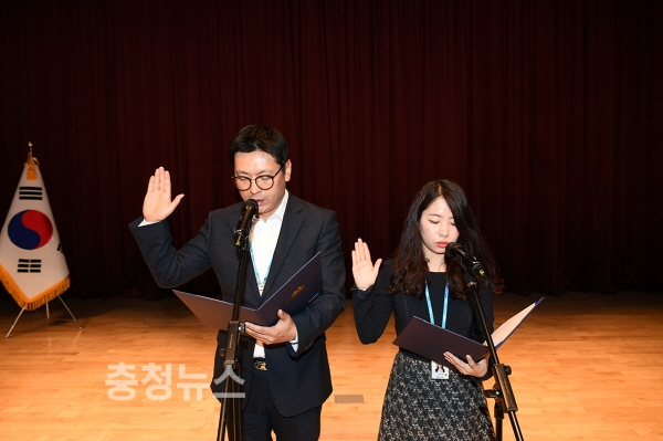 2일 추사홀에서 전국동시지방선거 선거중립 결의대회(사진은 예산군청 천홍래 신현정 주무관이 선거중립 결의를 하고 있는 모습)