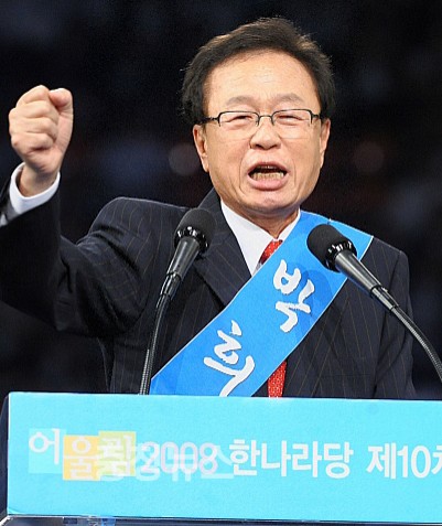 박 전 부의장은 3일 서울 올림픽 체조경기장에서 열린 한나라당 제10차 전당대회에서 6129표(29.7%)를 얻어 5287표(25.6%)를 얻은 정몽준 의원을 제치고 차기 대표 최고위원(임기 2년)으로 당선됐다.