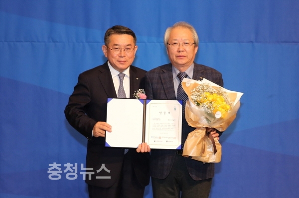 한국서부발전 강동환 국정과제추진실장(오른쪽)이 김준동 대한상공회의소 상근 부회장으로부터 상패를 수여받고 기념촬영한 모습