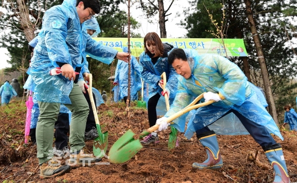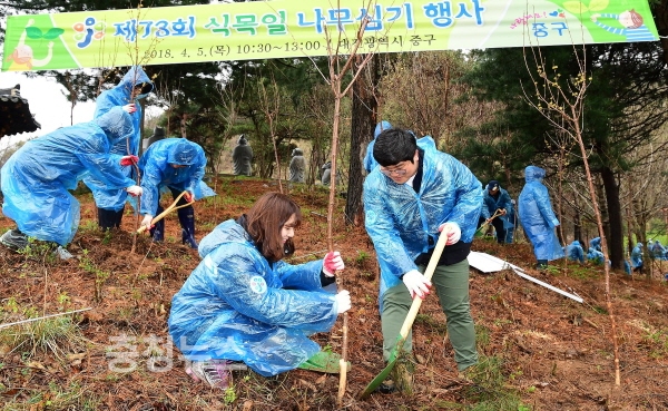 대전 중구(구청장 박용갑)는 5일 푸르고 아름다운 녹색도시를 만들기 위해 침산동「뿌리공원」일원에서 ‘제73회 식목일 나무심기 행사’를 개최했다.