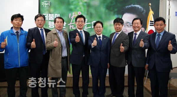 허태정 예비후보 선거사무소 개소식에 참석한 박종래 민주당 대전 대덕구지역위원장, 김경훈 대전시의장, 강래구 동구지역위원장, 박범계 시당위원장, 송행수 중구지역위원장, 장종태 서구청장, 박용갑 중구청장