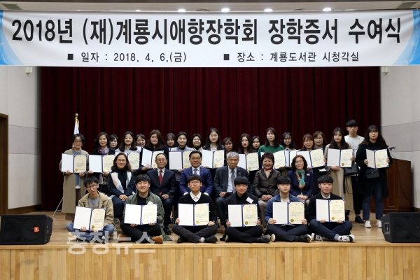 (재)계룡시애향장학회(이사장 최홍묵)가 6일, 계룡도서관 시청각실에서 학부모와 교사 등 100여 명이 참석한 가운데 장학증서 수여식을 개최했다.