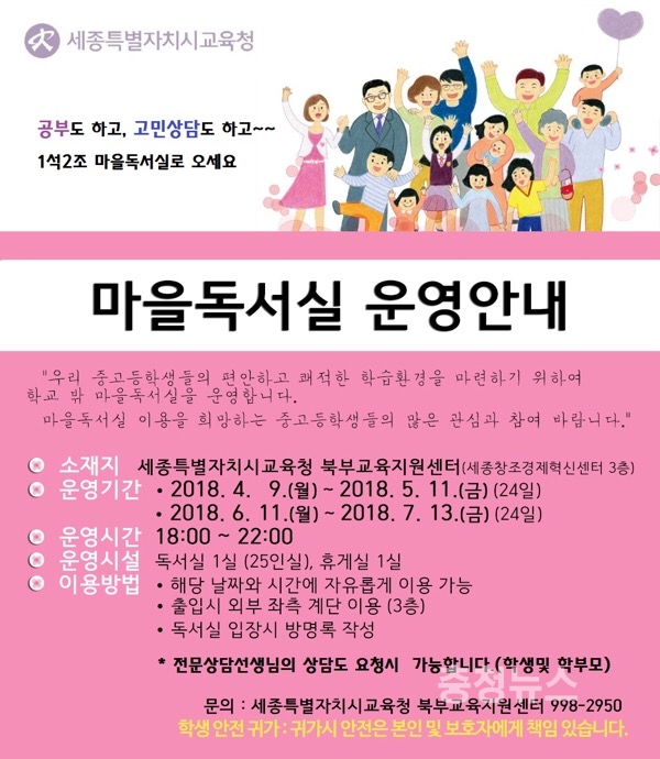 세종시교육청(교육감 최교진)은 중간고사 기간과 기말고사기간에 북부교육지원센터를 마을독서실로 운영한다.