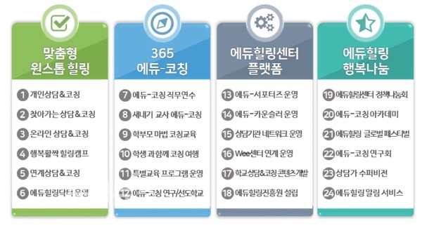올해 에듀힐링센터는 맞춤형 원스톱 힐링, 365 에듀-코칭, 에듀힐링센터 플랫폼, 에듀힐링 행복나눔 등 네 가지 핵심과제를 설정하고, 상담 및 코칭, 캠프, 연수, 특강 등 총 24가지 세부 사업을 추진한다.