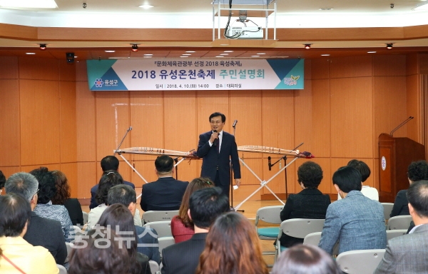 대전 유성구는 10일 구청 대회의실에서 주민 및 구의원 등 120여 명이 참석한 가운데 내달 11일부터 13일까지 열리는 2018 유성온천축제 주민설명회를 가졌다.