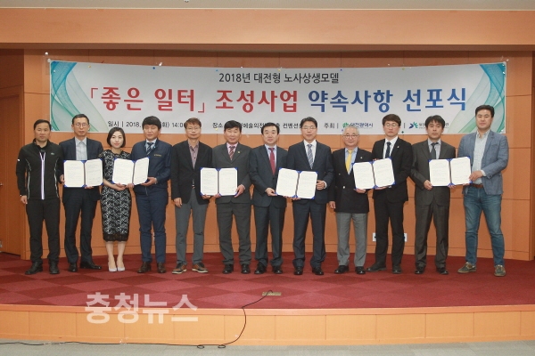 대전형 노사상생모델 ‘좋은 일터’ 조성사업에 선정된 20개 기업이 10일 대전예술의전당 컨벤션홀에서 근로시간 단축, 정규직 전환 등 약속사항을 선포했다.