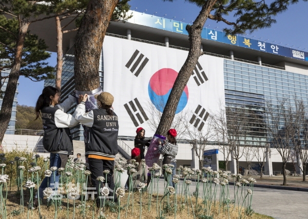 지난 4일 SLD(스마트리빙디자인)연계전공 지역 창의 디자인프로젝트 수업 12명의 학생들이 상명대학교 대로변 가로수에 전시 작업을 해 학생들과 시민들에게 깊은 인상을 남겼다.