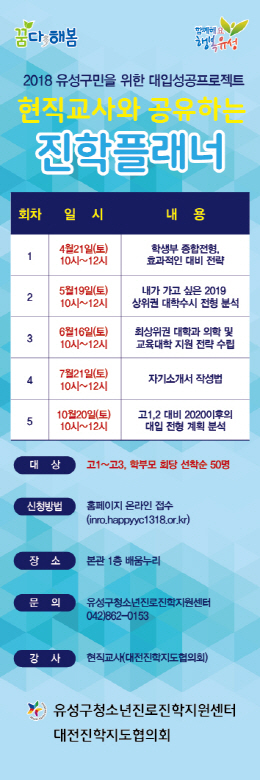 유성구 학부모와 고교생들을 대상으로 회당 50명을 모집하며, 유성구 청소년진로진학지원센터 홈페이지에서 신청할 수 있다.