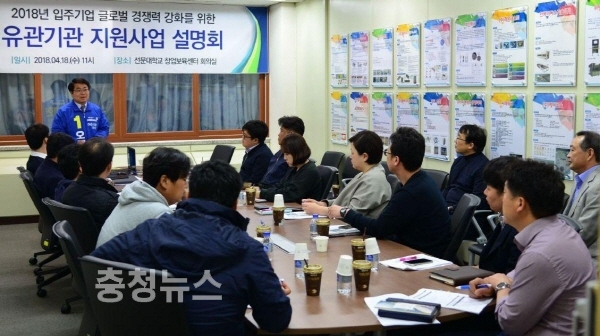 오세현 더불어민주당 아산시장 예비후보가 18일 선문대학교 창업보육센터 3층 회의실에서 입주기업 대표들과 대학 창업보육센터 지원방안과 지방정부의 기업지원 방안, 벤처기업 발전 방향 등에 대한 논의가 이루어졌다.