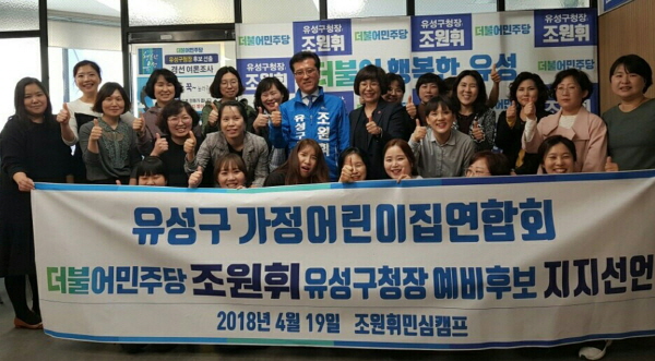 유성구 가정어린이집연합회(이하 연합회)는 조원휘 더불어민주당 유성구청장 예비후보에 대한 지지를 공식 선언했다.