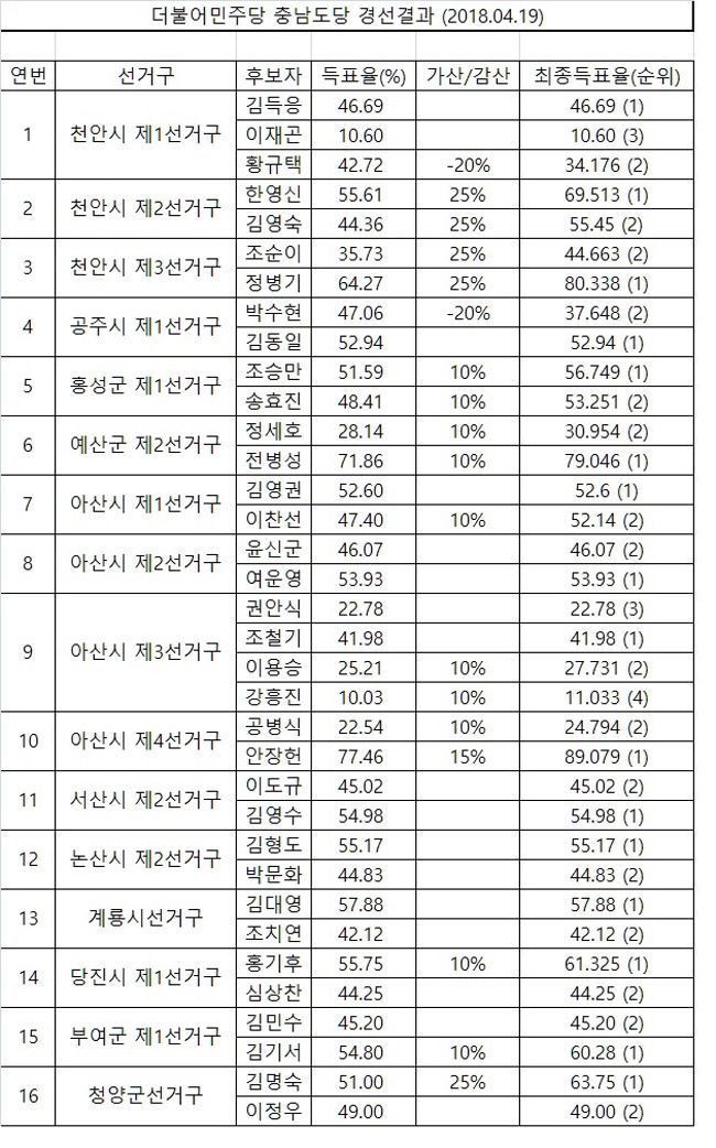 더불어민주당 충남도당은 18일부터 19일까지 이틀간 진행된 6‧13지방선거 광역의원 16개 선거구 경선결과를 19일 오후 늦게 발표했다.