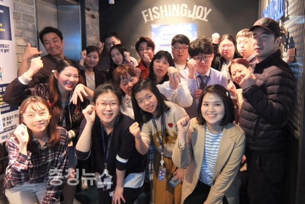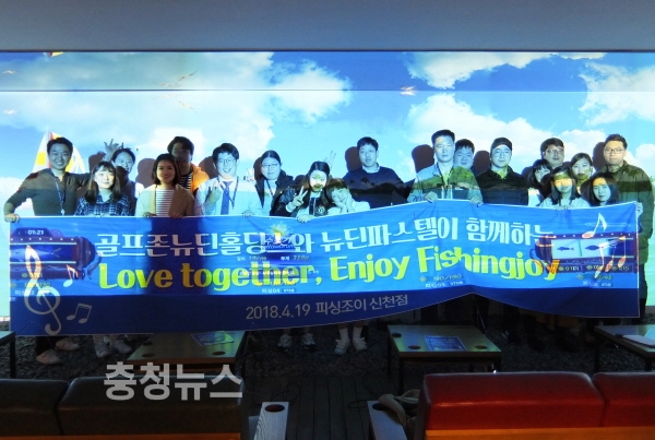 골프존뉴딘그룹 계열사 ㈜뉴딘파스텔이 지난 19일 서울 송파구의 스크린낚시장 ‘피싱조이’에서 장애인과 비장애인 직원이 함께 하는 피싱조이 레저 행사를 열고 직원 간 뜻 깊은 화합의 장을 마련했다.