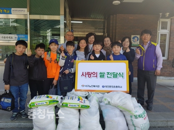 대전문정초등학교(교장 조규정)는지난 1일부터 18일까지 전교생을 대상으로 쌀모으기 행사를 진행하고 정성으로 모은 쌀 500kg을 20일 서구노인복지관(관장 장곡스님)에 기탁하는 “사랑의 쌀 전달식”을 실시했다.