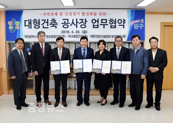 대전 중구(구청장 박용갑)는 지난 20일 청사 구민사랑방에서 ㈜청산종합건설(대표 이윤환), ㈜파크종합건설(대표 이수경), 대한전문건설협회 대전광역시회(회장 김양수)와 함께 지역 건설경기 촉진을 위한 업무협약을 체결했다.