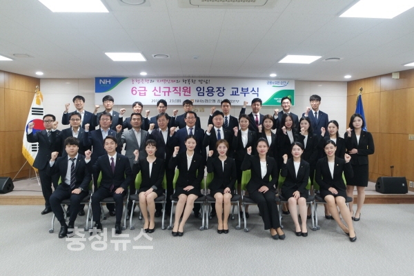 NH농협은행 충남영업본부(본부장 원종찬)는 23일 충남영업본부 중회의실에서 6급 신규직원 23명에 대한 임용장 교부식을 갖고 새내기 행원의 첫 걸음을 축하했다.