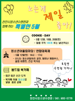 5월 12일에는 수련관 야외 특설무대에서 천안시청소년어울림마당 개막식과 청소년문화기획단에서 직접 기획하고 운영하는 연합대축제가 펼쳐질 예정이다.