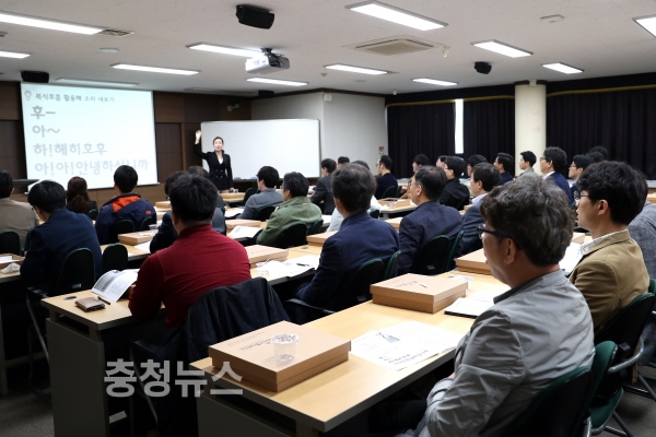 이어서 한밭대 교수들은 강사의 지도를 따라 메시지 전달력을 높이기 위한 발성과 호흡, 발음, 목소리의 톤을 조절하는 방법을 연습하고, 내레이션 실습을 실시하는 등 수업몰입도와 강의력 높이기에 열중했다.